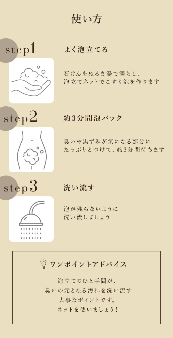 ジャムウソープの使い方は簡単!泡たてネットなどで立てたふんわり泡を、デリケートゾーンの臭いや黒ずみ汚れなどの気になる部分にのせて、3分間パックするだけ。アソコのニオイを洗い流して、素肌をスッキリ爽快ケア。
