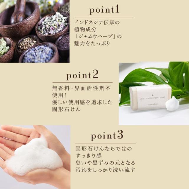 ●ジャムウ・ハーバルソープは、化学香料・保存料・合成界面活性剤などの化学添加物は配合せず、厳選したジャムウハーブの独自のブレンド方法によりつくられています。