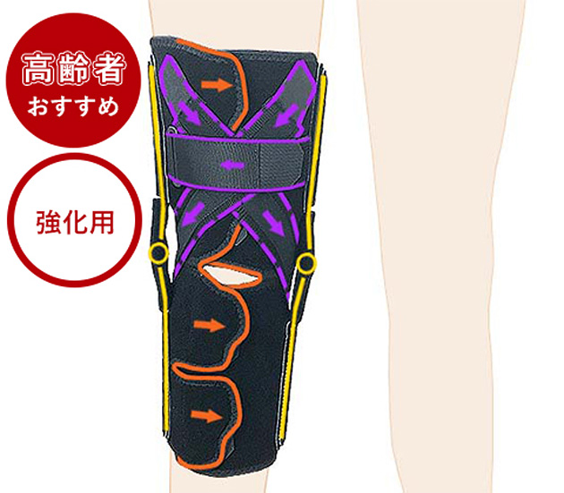 補助ベルトとアルミステーで膝の捻じれをしっかりと防ぎます。膝全体を補強するので、ヒアルロン酸注射などの治療をしても痛みが良くならない方におすすめです。