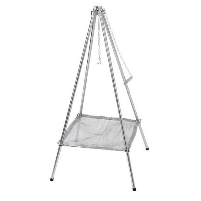 燃焼効率が良いメッシュタイプの焚き火台です。ダッチオーブン25cmや鍋が吊るせるチェーン付き。吊り下げ位置が自由に変えられる自在チェーン。一台二役。メッシュベースを外せば、小型グリル用の四脚スタンドとしても使えます。丸めてコンパクト収納。収納バッグ付き。