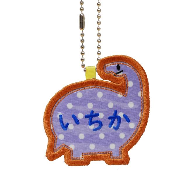 キッズ お名前タグ(名入れキーホルダー) 恐竜2 na-kyoryu2 紫に白水玉柄 水色系縁色 名前刺繍糸青系