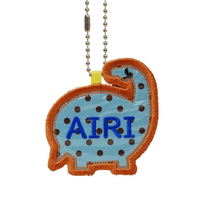 キッズ お名前タグ(名入れキーホルダー) 恐竜4 na-kyoryu4 水玉(ミントチョコ)柄 水色系縁色 名前刺繍糸青系