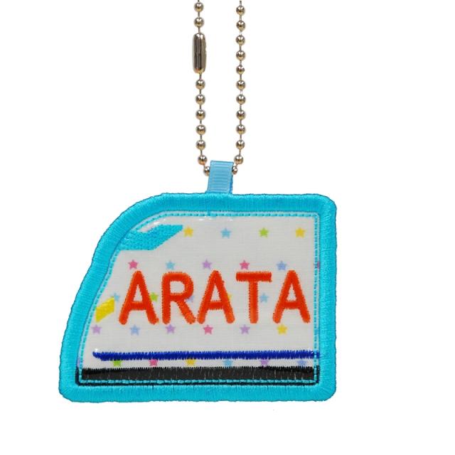 キッズ お名前タグ(名入れキーホルダー) 新幹線3 na-shinkan3 カラフル星柄 水色系縁色 名前刺繍糸オレンジ系