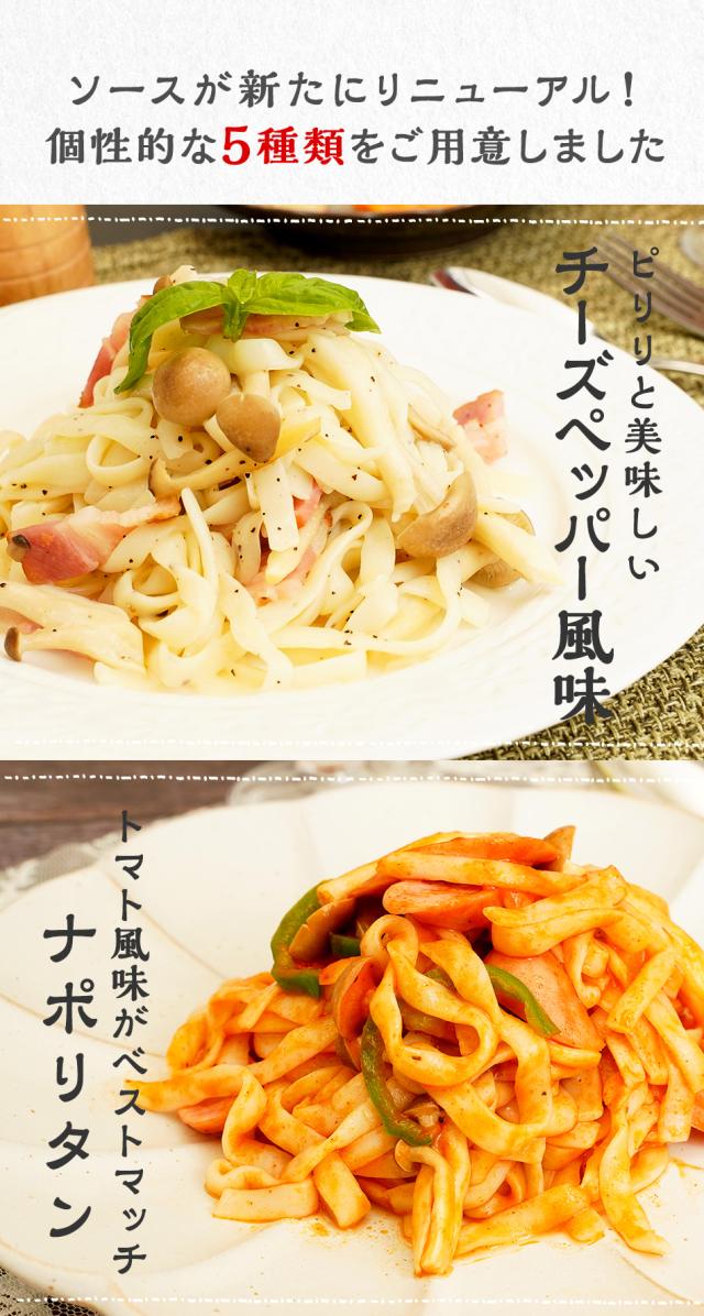 パスタソースが6種類になりました!ぺペロン、ナポリタン、塩、ミートソース風、チーズソース、キーマカレー 各1つ+ランダムで2つお付けします!