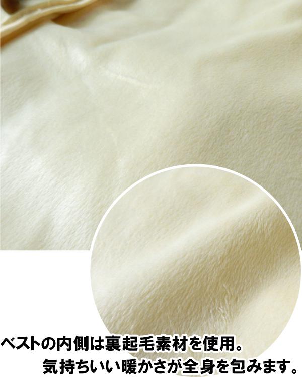 ベストの内側は裏起毛素材を使用しているので、肌触りもよく、気持ちいい暖かさが全身を包みます。