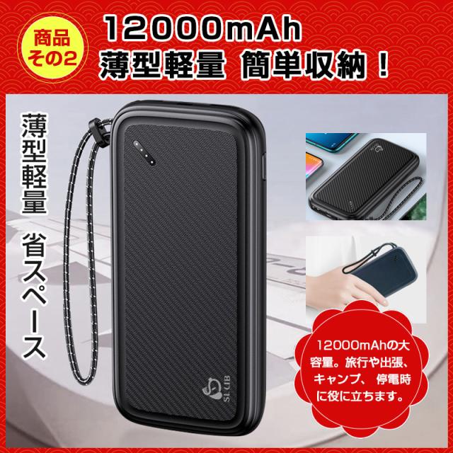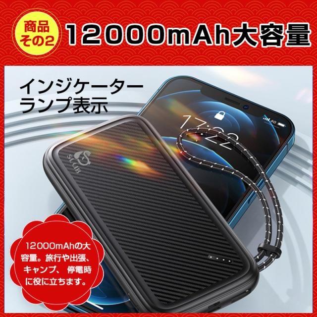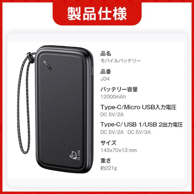 12000mAh 大容量、ポリマー電池は性能が高く、自己放電が少なく、長時間利用可能。