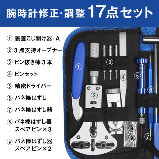 時計工具セット 腕時計 本格仕様 修理工具 時計工具 セット メンテナンス工具17種セット ベルト交換 調整 電池交換 時計のメンテナンスに 3点支持オープナー 裏蓋外し ばね棒はずし ハンマー ドライバー ピンセット 送料無料