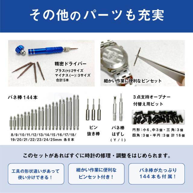 ・精密ドライバーや細かい作業に便利なピンセット、バネ棒までついて、すぐに時計修理が始められます