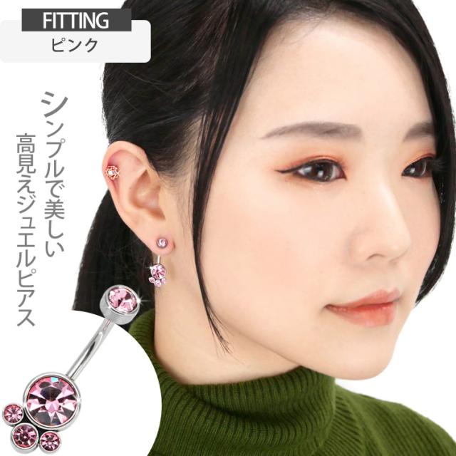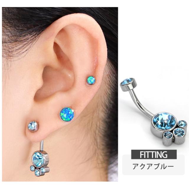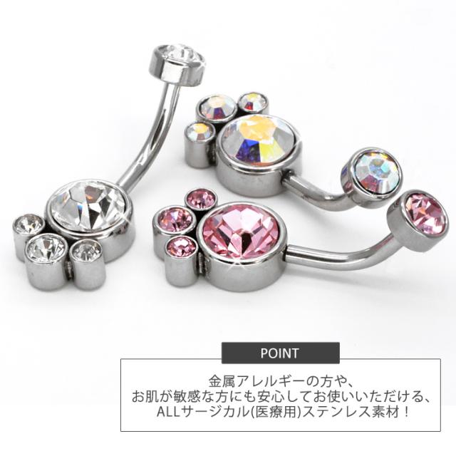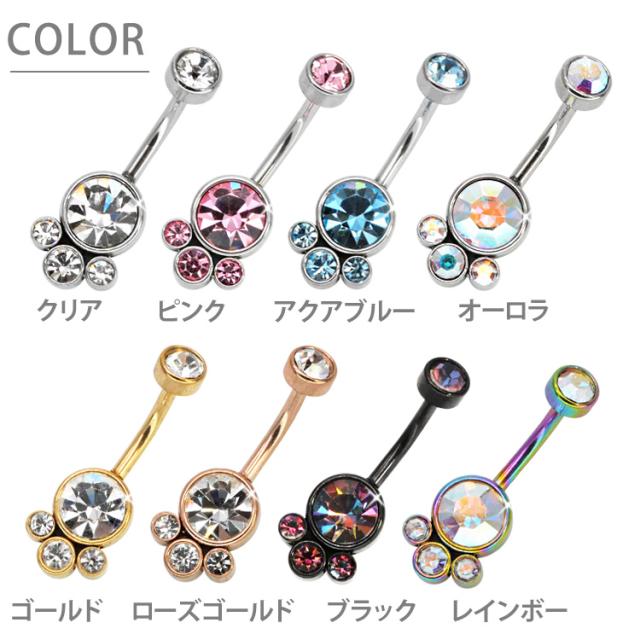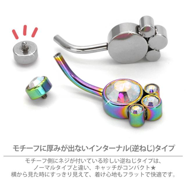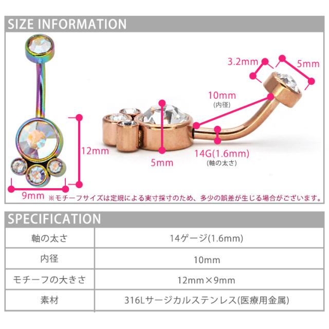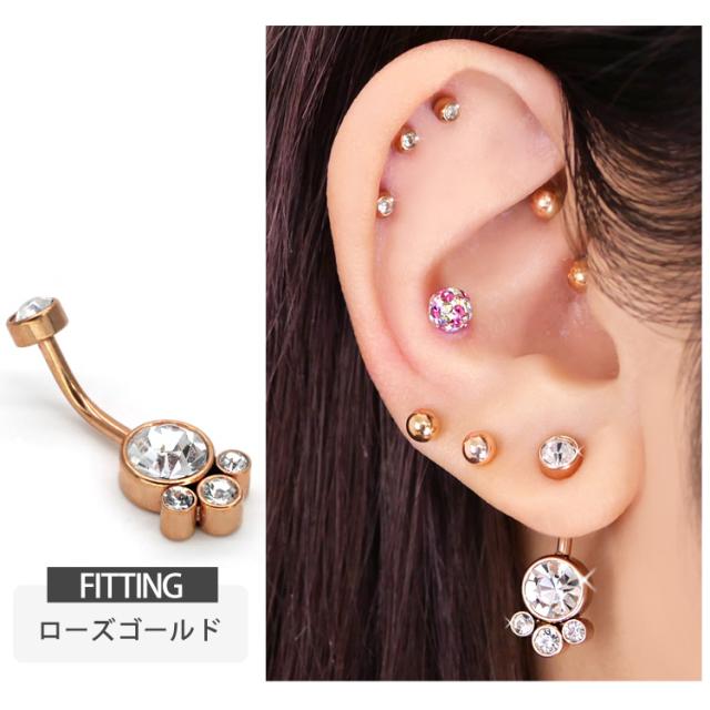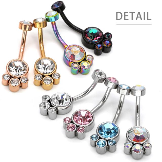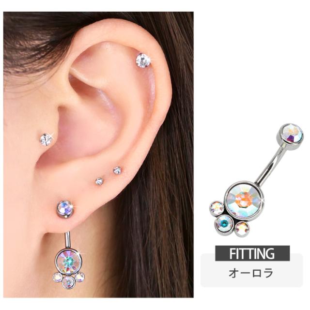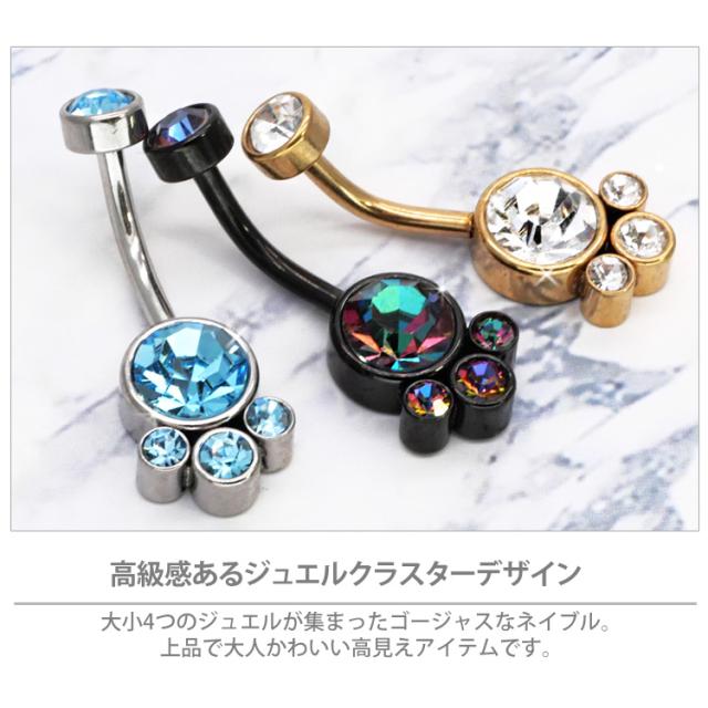 大小4つのジュエルが集まったゴージャスなネイブル。 上品で大人かわいい高見えアイテムです。 モチーフ側にネジが付いている珍しい逆ねじタイプなので、キャッチがコンパクトで横から見た時にすっきり見えて、着け心地もフラットで快適です。 初心者から上級者まで幅広く愛されているボディジュエリーは、アレルギーが起きにくいサージカル(医療用)素材なので安心です。へそピアスにはもちろん、イヤーロブや耳の軟骨ピアスにつけてもかわいい。