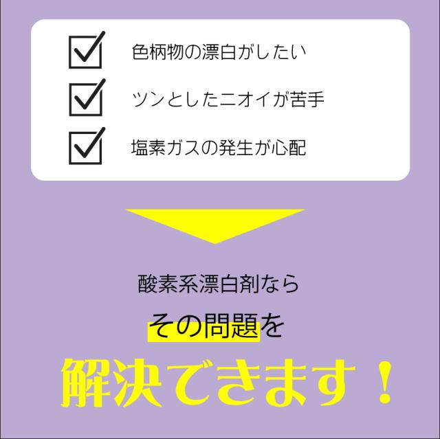 成分の過炭酸ナトリウムを溶かして発生する酸素の力で漂白・消臭・除菌するので様々なシーンでご利用頂くことができます。