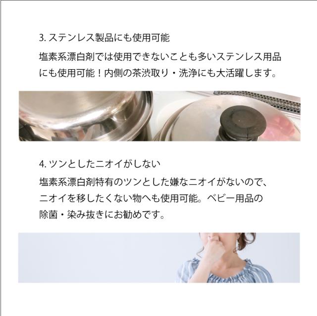 塩素系漂白剤特有のあのツンとした嫌な匂いが無いので匂いを移したくないものへも使用可能。ベビー用品の除菌・染み抜きにもおススメです。