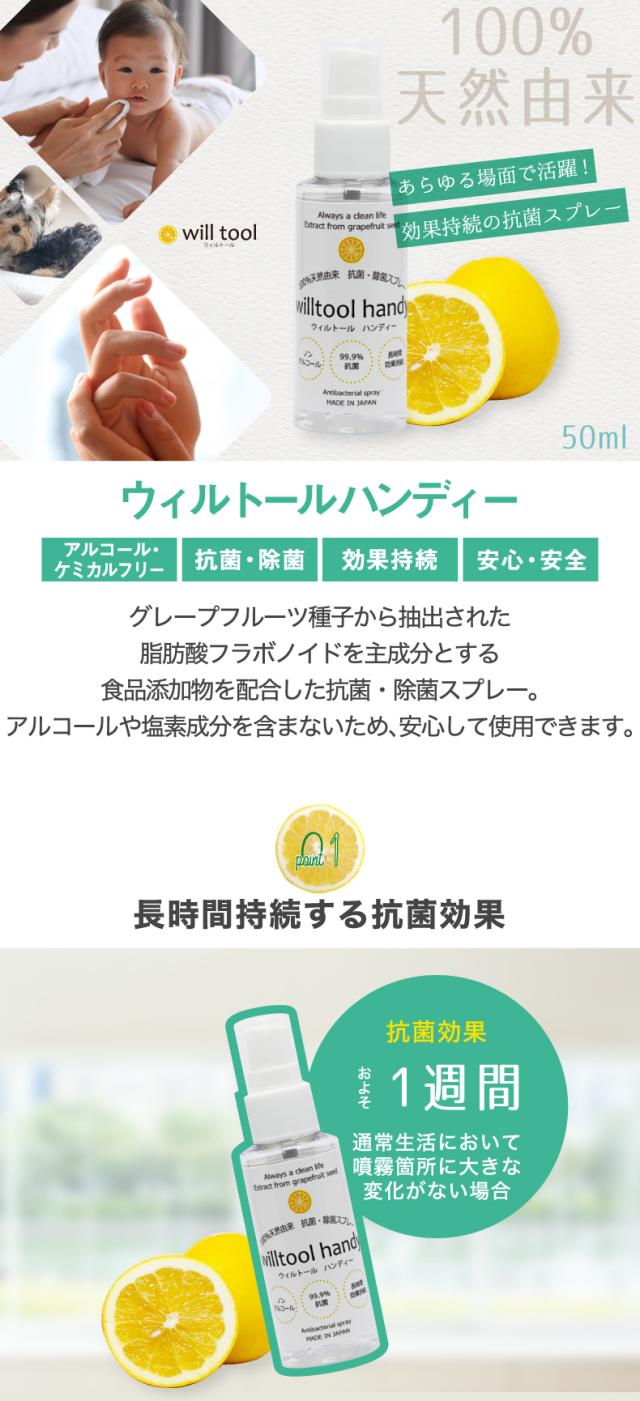 ウィルトール ハンディー 50ml | 日本製 ノンアルコール スプレー ボトル 100%天然由来 抗菌 除菌 抗ウイルス 除去99% 防カビ 効果長持ち 安心 安全 赤ちゃん 子供 車内 ペット マスク ドアノブ 加湿器OK オフィス おもちゃ トイレ 玄関 台所 リビング 介護 保育 おしゃれ