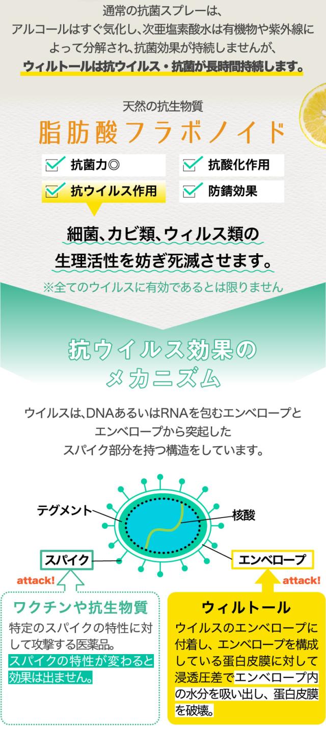 ●ウィルトールはグレープフルーツ種子から抽出されたポリフェノール(脂肪酸フラボノイド)を主成分とする抗菌・除菌スプレーです。脂肪酸フラボノイドは抗菌力が非常に高く、揮発性がほとんどないため、効果が持続します。