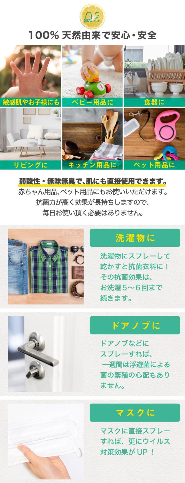 ドアノブなどにスプレーすれば、一週間は浮遊菌による菌の繁殖の心配もありません。