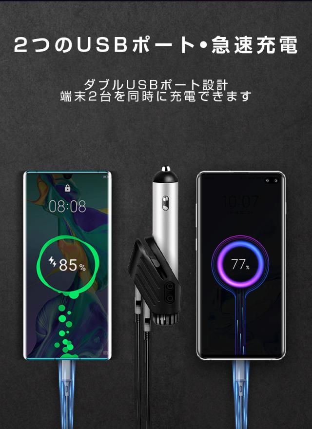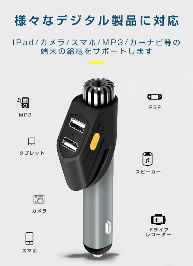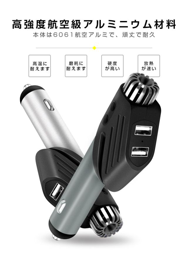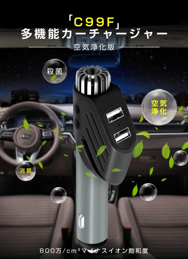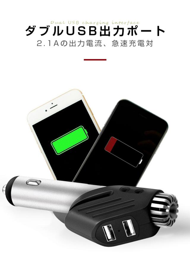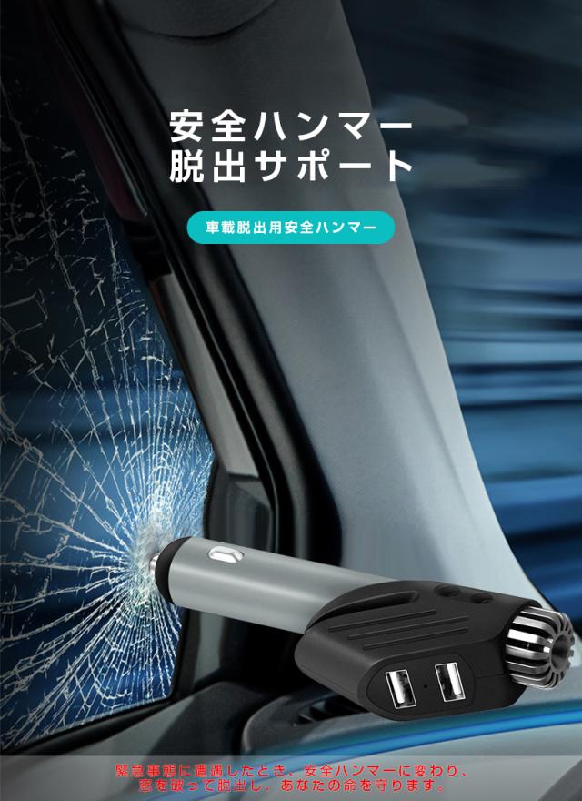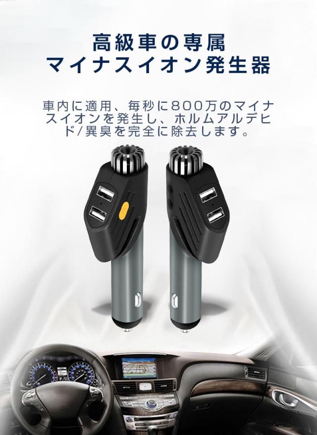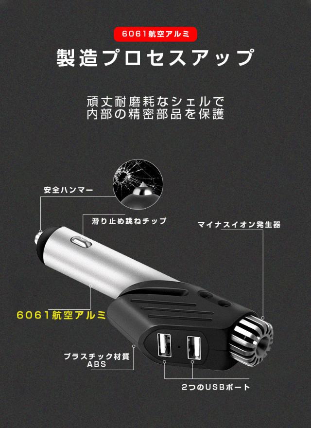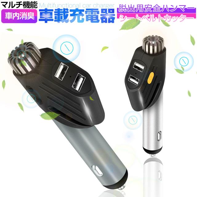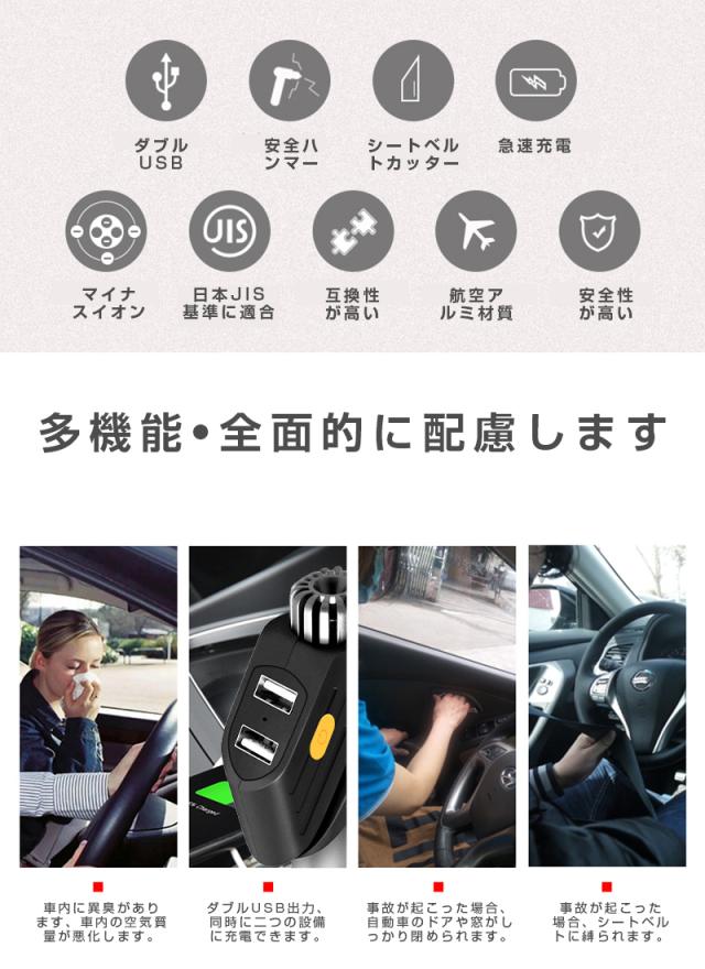 カーチャージャー シートベルトカッター ハンマー 空気浄化 多機能 マイナスイオン 車載充電 5V-2.1A出力 2USBポート 高速充電 【PL保険加入済み製品・安心】