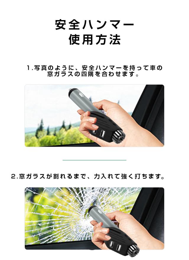 【安全ハンマー機能】本製品の底部は安全ハンマーとして使用でき、ガラスに垂直にし、強く叩くと、ガラスが割れます。