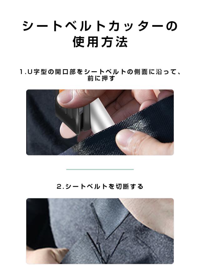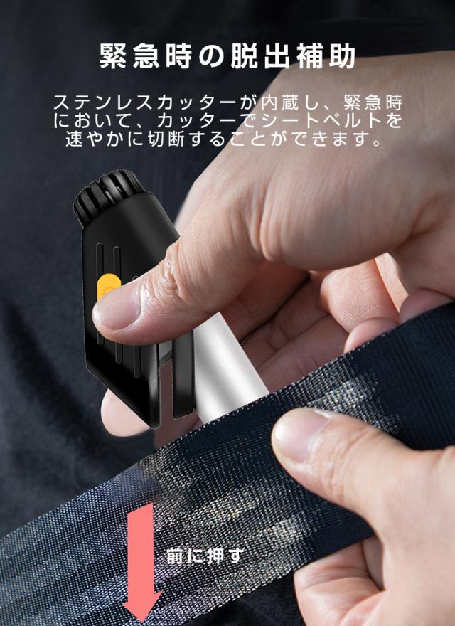 【シートベルトカッター機能】錆びに強いシートベルトカッターが内蔵しており、緊急時にシートベルトの切断ができます。シートベルトをぴんと張り、シートベルトカッターとシートベルトを約45°の角度で斜めに切り、簡単にシートベルトを切断できます。