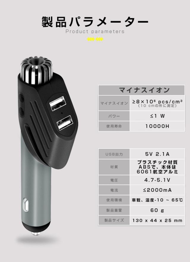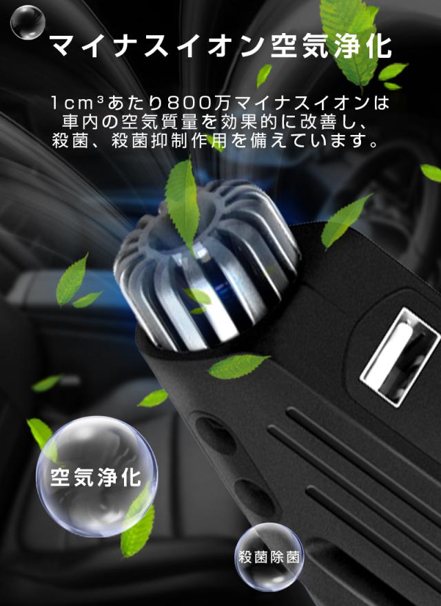 【マイナスイオン機能】1立方センチメートルあたりに800万個のマイナスイオンを発生できます。大量のマイナスイオンの発生により、車内の異臭やアレルぎ物質、浮遊菌、カビ菌もイオンで取り込み、それらを分解または排除し、車内空気を改善します。