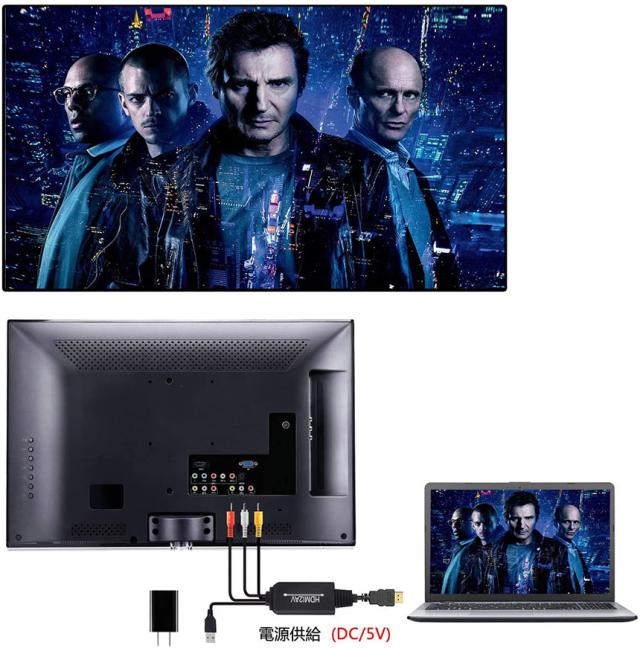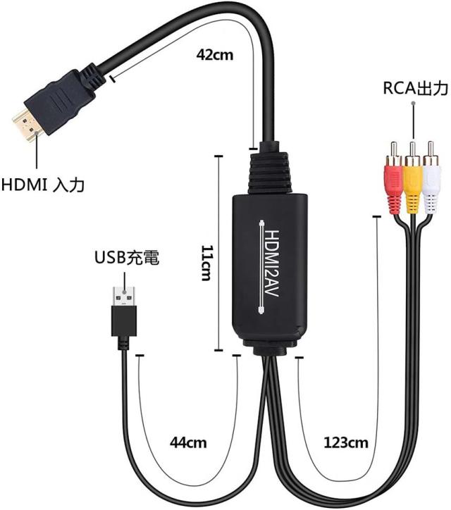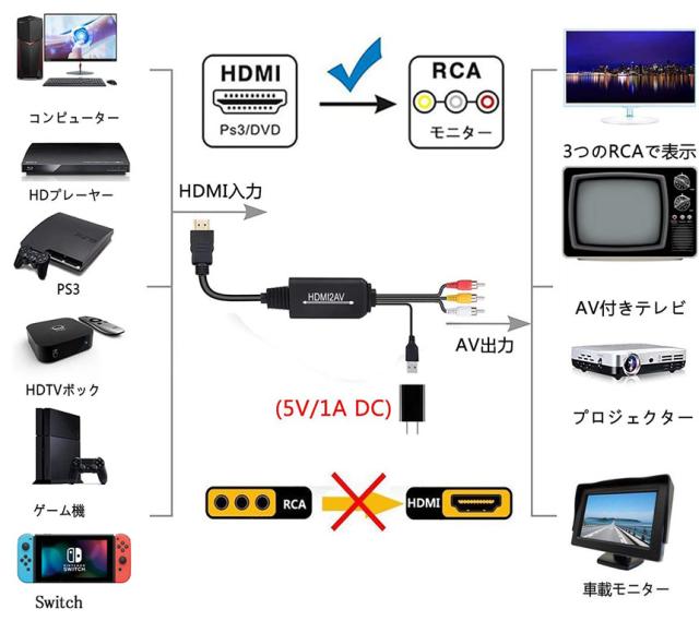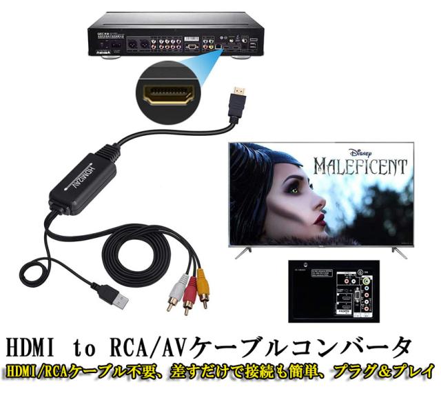 【HDMIからRCAへ 変換ケーブル】HDMI2AVコンバーターは、HDMI映像信号をアナログコンポジット(RCA)に変換することができます。HDMI入力のないモニターに変換アダプタを接続するだけでHDMI対応機器機器の映像や音声を映すことができます。※逆方向(AV to HDMI)にはご使用できません。【コンバータ内蔵】古いテレビ/ディスプレイで新しいHDMIデバイスを再生します。他のHDMI - RCAケーブルとは異なり、このコンバータは内蔵コンバータを備えています。余分なコンポーネントが不要になるため、お金を節約できます。RCA、AV、コンポジットは同じ時間です。