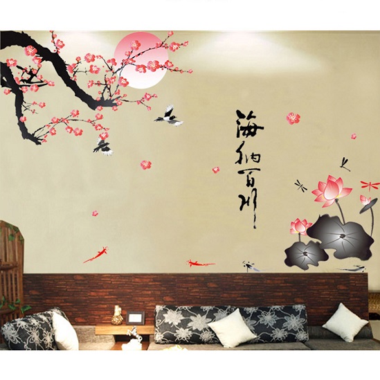 ウォールシール 梅と蓮 書道 和風 壁ステッカー 花鳥風月 鯉 トンボ 早春 取り外し可能 漢字 木の枝 居間 和室 洋室 玄関の景観