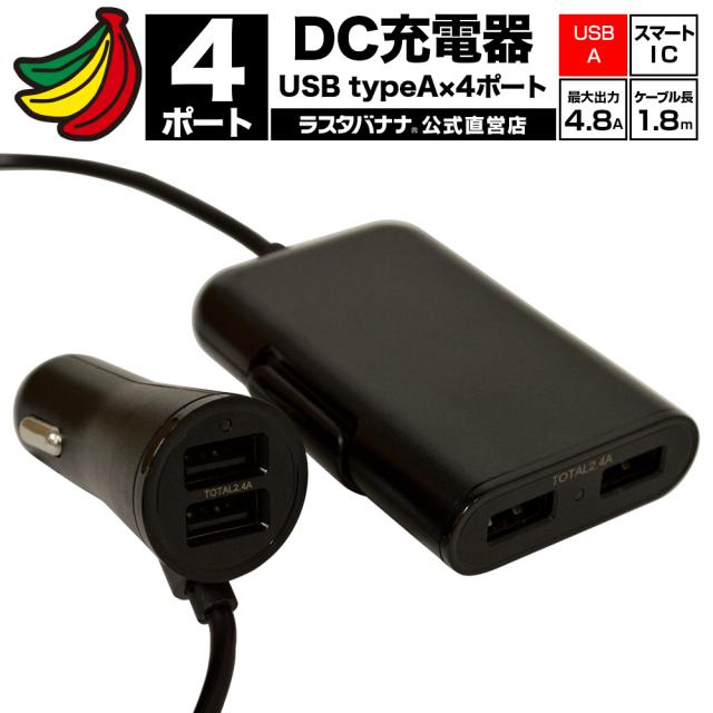 【ネコポス便不可】 ラスタバナナ 車の充電器 USBポート付 DC充電器 4.8A 5V タイプA 4ポート ケーブル1.8m DC USB Type-A×4 ブラック 12V 24V対応 スマートIC R18DC4A4A01BK