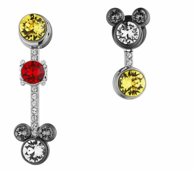 スワロフスキー 『Mickey Mouse Pierced ピアス』です。ミッキーミスマッチピアス、サイアム&トパーズ-ピアス:チェーン1つ、ドロップ1つ。 精密カットクリスタル、グラファイト、ライトサイアム、トパーズ、真鍮にガンメタルとパラジウムをメッキ、ディズニーのコラボレーション。