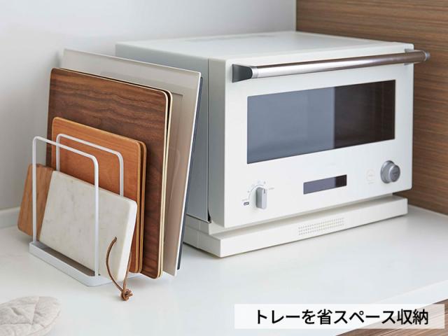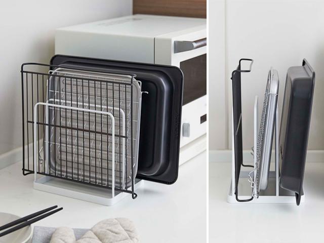 置き場所に困るトレーやトースターの天板などを省スペースで収納できるスタンド。
