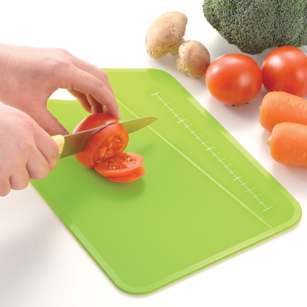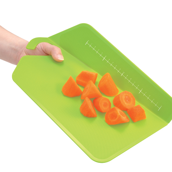 簡単に折り曲げることができ、切った食材をこぼさずお鍋に入れることのできるまな板です。指を差し込める部分があるので持ち運びがしやすいユニークな形状です。