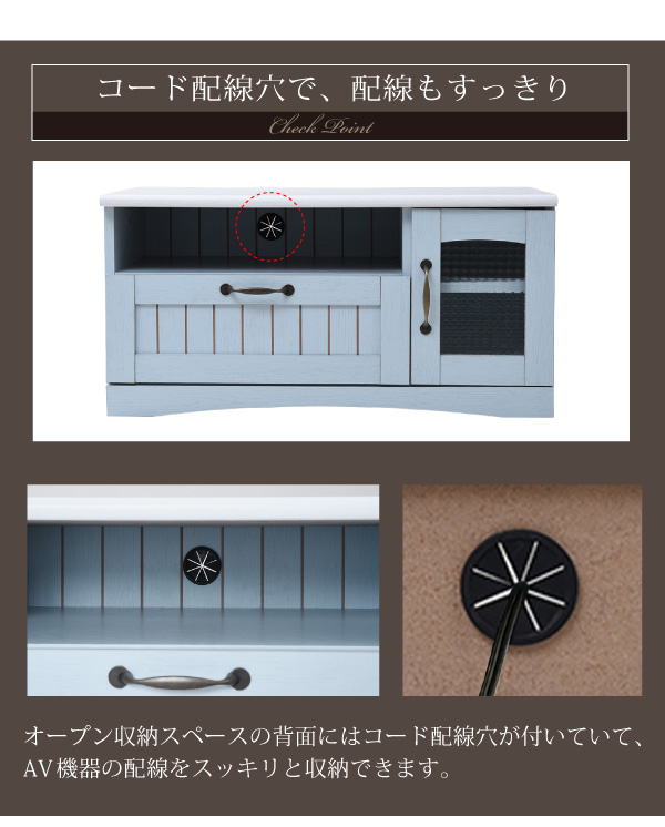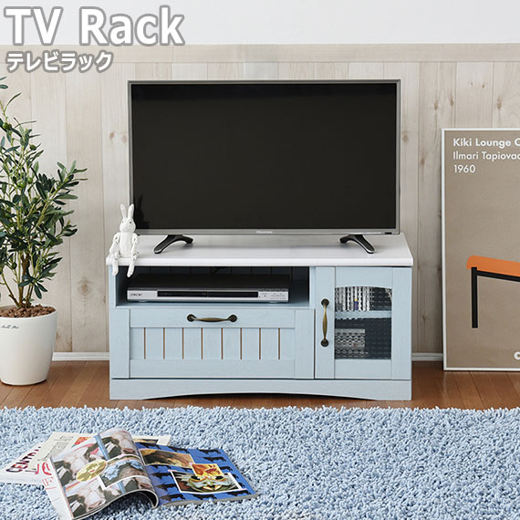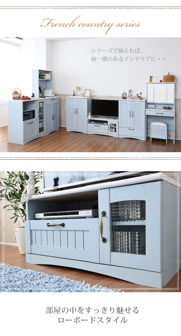 Azur アジュール テレビラック (テレビ台 収納 引き出し ローボード コンパクト オープンスペース AV機器 配線穴 PVC 木目柄 アンティーク フレンチカントリー バイカラー ブルー ホワイト おしゃれ おすすめ)