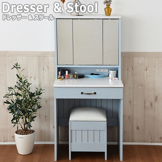 Azur アジュール ドレッサー&スツール (ドレッサー スツール 化粧台 扉内収納 可動棚 引き出し 3面鏡 コンセント コンパクト PVC 木目柄 アンティーク フレンチカントリー バイカラー ブルー ホワイト おしゃれ おすすめ)