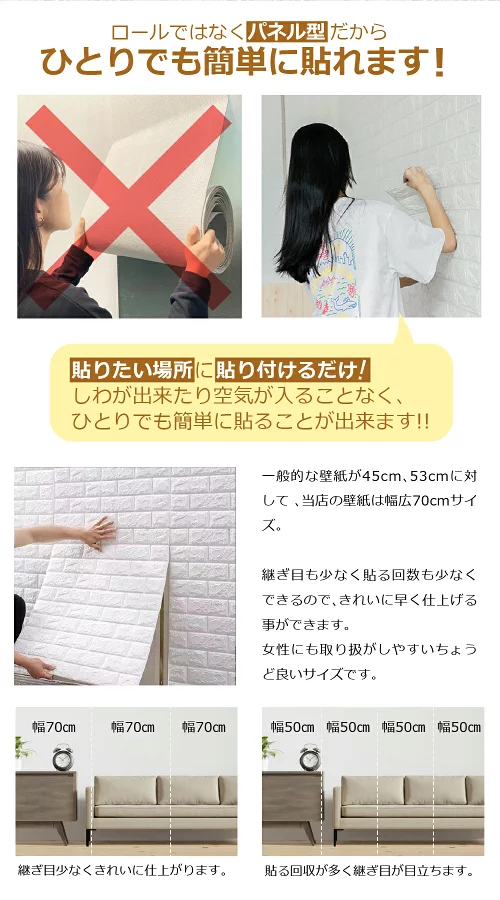 壁紙 壁紙シール 70cm × 77cm 30枚 のり付き リメイクシート ウォールステッカー 貼り替え 補修 ホワイト 白 レンガ クッション おしゃれ DIY 北欧 クロス 保護 壁 キズ 家具 寝室 部屋 リビング キッチン トイレ