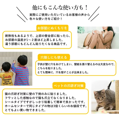 〇 シールタイプなのでハサミやカッターで好きな大きさにカットして貼るだけととても簡単にリフォームや模様替えができます。(粘着力が弱い場合は壁紙用接着剤をご使用下さい)
