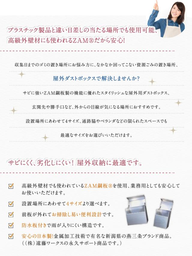ゴミ収集日までゴミの置き場所にお悩みの方に…なかなか回って行い資源ごみの置き場所、 屋外ダストボックスで解決しませんか? サビに強く美しい表情の高耐食溶融めっき鋼板ZAM?※を使用した、機能に優れたスタイリッシュな屋外用ダストボックス、 玄関先や勝手口など、外からの目線が気になる場所におすすめです。 設置場所にあわせて4サイズ、通路脇やベランダなどの限られたスペースでも 最適なサイズをお選び頂けます。 さらに、前板が外れて出し入れやお掃除がしやすい便利設計!持ち上げるだけで前面の板がまるごと外れます!さらに蓋を閉めた際、内部に雨水が入りにくい防水板付き。 サビに強いZAM?(高級外壁材でも使われています)を使用した、機能に優れたスタイリッシュな屋外用ゴミステーション、 玄関や勝手口など外からの目線が気になる場所におすすめです。 ※ZAM?は日本製鉄株式会社の登録商標です。 ・サビにくく劣化しにくい高級鋼板ZAM?を使用。業務用としても安心してお使い頂けます。 ・サビにくく劣化しにくい高級鋼板ZAM?を使用。業務用としても安心してお使い頂けます。 ・設置場所にあわせて4サイズより選べます。 ・前板が外れてお掃除しやすい便利設計。 ・防水板付きで雨が入りにくい構造。 ・安心の日本製!金属加工技術で有名な新潟県の燕三条ブランド商品。 |