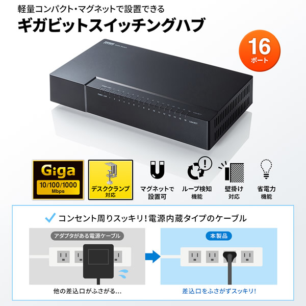 スイッチングハブ 16ポート ギガビット対応 マグネット付き サンワサプライ LAN-GIGAP1602BK
