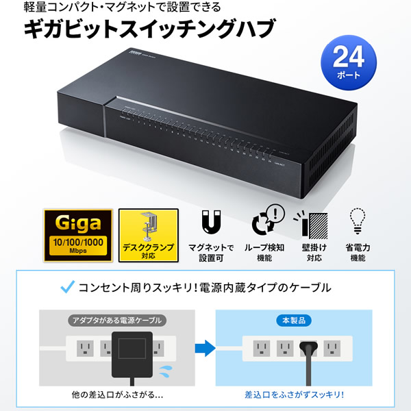 在庫あり スイッチングハブ 24ポート ギガビット対応 マグネット付き サンワサプライ LAN-GIGAP2402BK