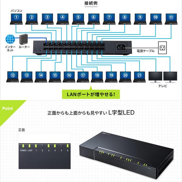■1000BASE-Tに対応した、24ポートスイッチングハブです。 ■強力マグネットを搭載しスチール製デスクやキャビネットなどにしっかり固定できます。 ■電源内蔵なのでコンセント周りをすっきりと配線できます。 ■ループ検知機能を搭載しており、ループ障害を音とLEDで知らせます。 ■ファンレス仕様なので、動作音が静かです。 ■ストレートケーブル、クロスケーブルを気にせず使える、AUTO-MDIX機能を搭載しています。 ■接続する機器に合わせて10/100/1000Mbps自動切り替えが可能な、AUTO-Negotiation機能を搭載しています。 ■リンクしていないポートを自動判別し電力供給を抑える省電力機能を搭載しています。 ■プラスチックケース採用のコンパクトデザインなので、設置場所を選びません。 ※記載は商品仕様の一部です。仕様説明不足等の理由での返品はできません。特に適合等は必ずご確認ください。
