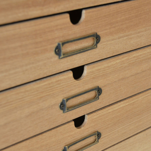 本体や引出しの前板などは、木目が美しいタモの突板を使用しています。クリア塗装を使用することで木材の濃淡が表れより一層、天然木本来の自然な風合いを感じていただけます。