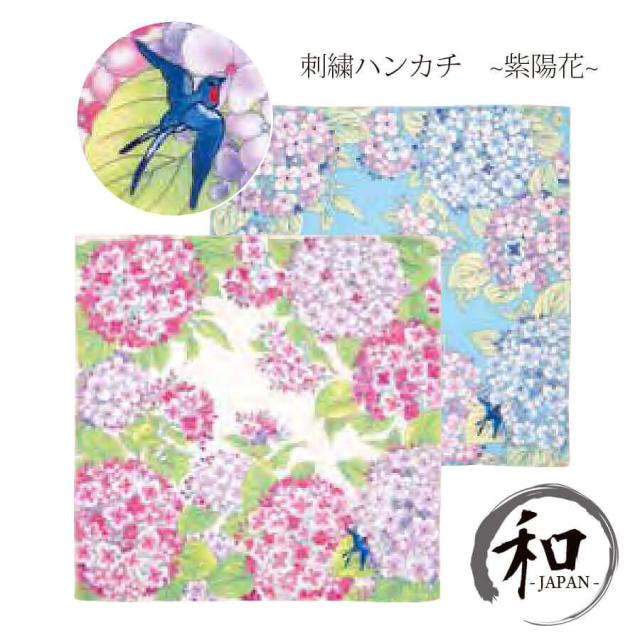 夏新作 ハンカチ はんかち 花柄 ピンク ブルー 青 紫陽花 あじさい ツバメ 刺繍 贈り物 プレゼント お祝い 記念品 日本製 メール便5ポイント