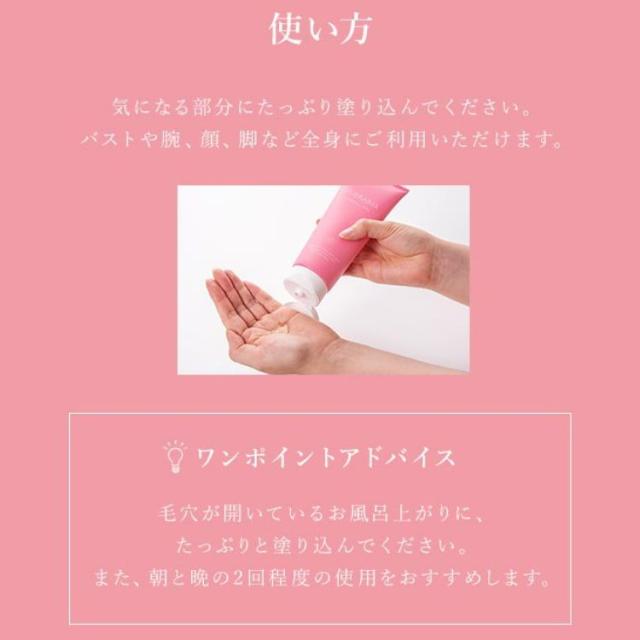 また、このジェルは、バストアップのためのケアにも嬉しいクリーム(ジェル)です。 バストマッサージをする時に手の平になじませて使えば、ギュッとした実感を得られやすくなります!