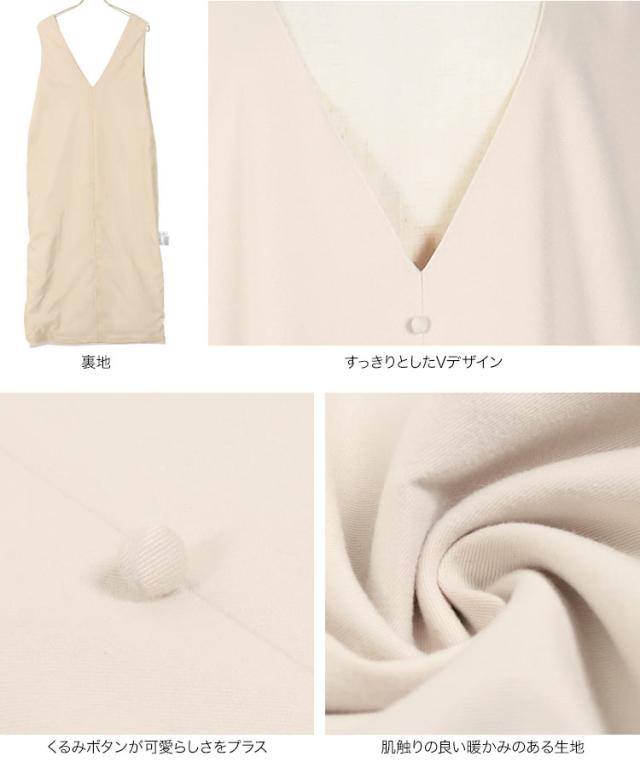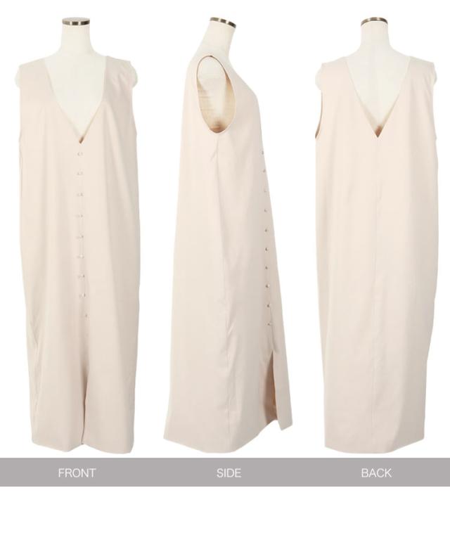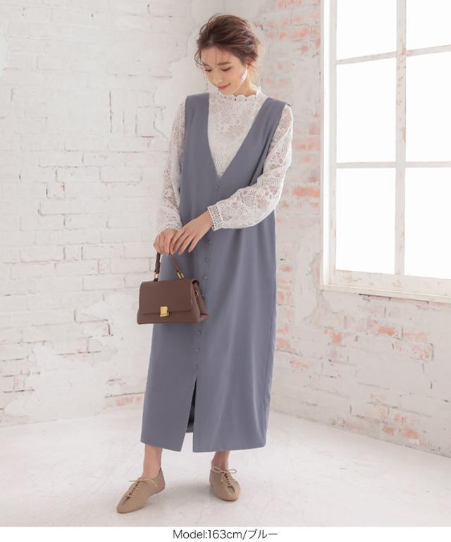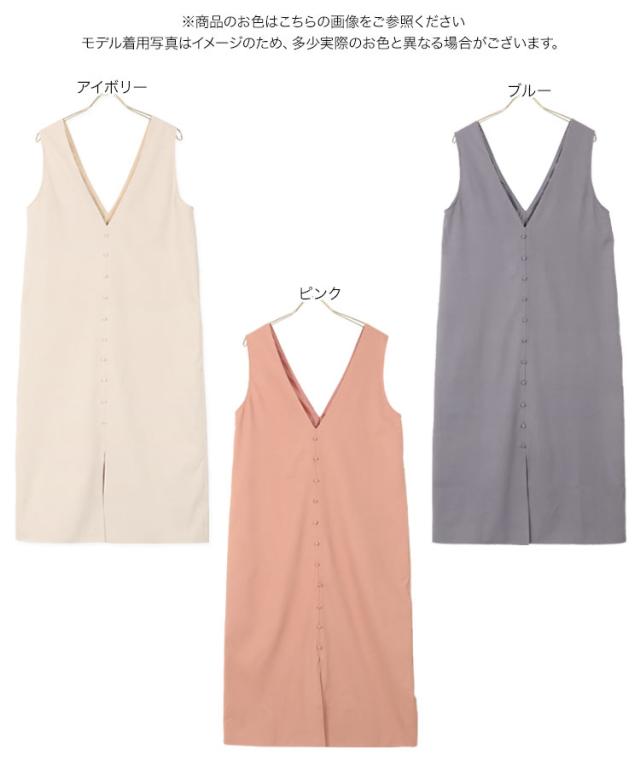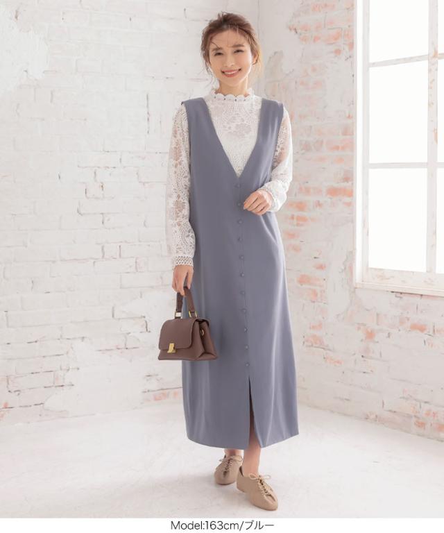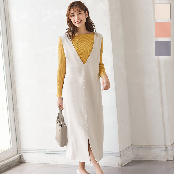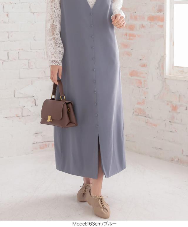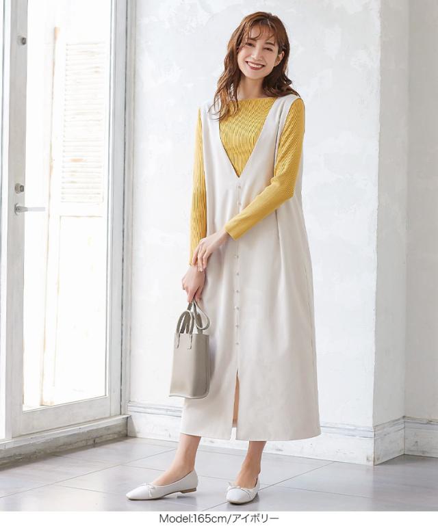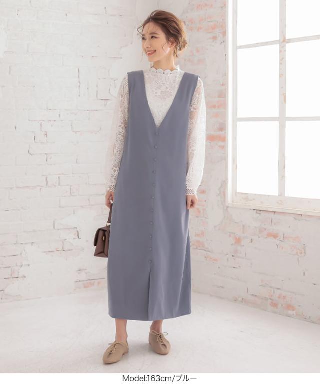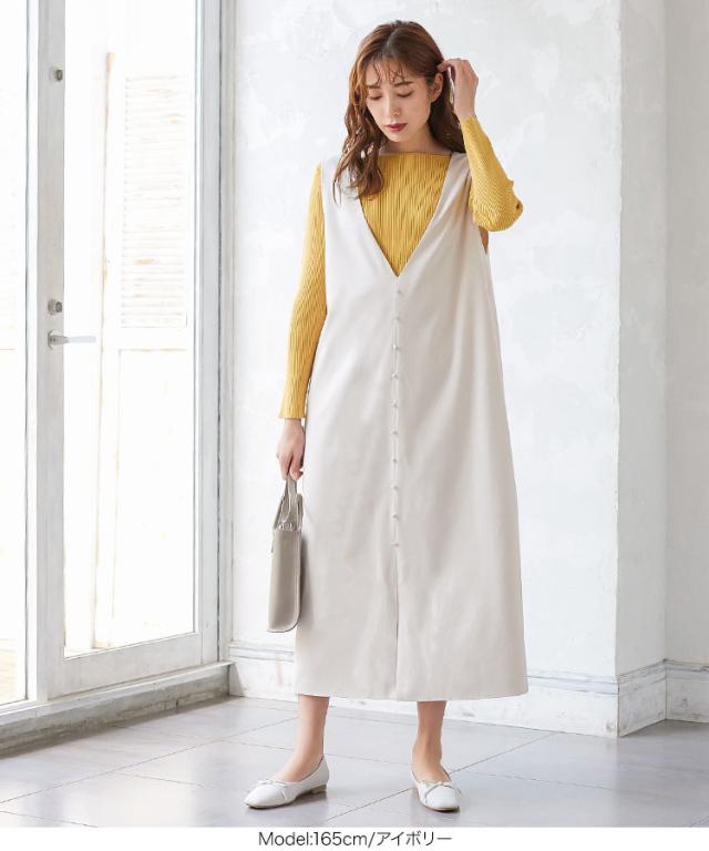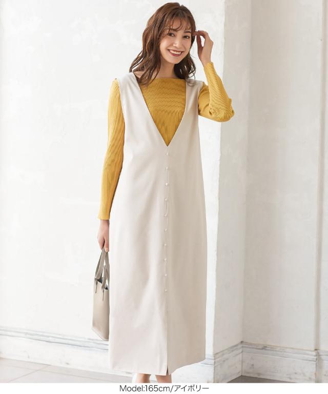 くるみボタンVネックフロントスリットジャンパースカート E2675 入荷済 OR プレゼント レディース 体型カバー ロング 大人 上品 ゆったり 白