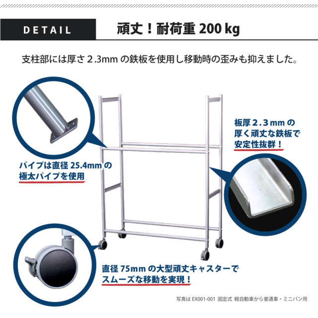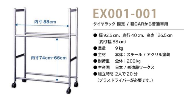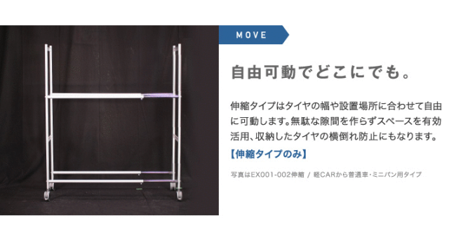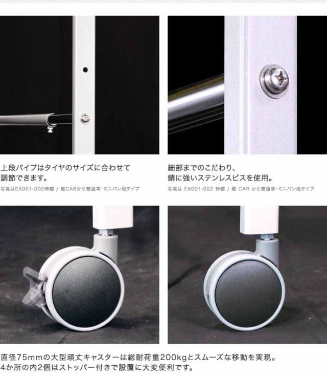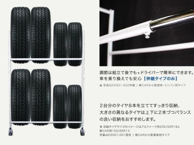 場所を取る2台分のタイヤをこれ1台にスッキリ収納。 シーズンオフのタイヤを立てて収納可能。 別売のタイヤラックカバーもかけて収納すれば、タイヤの劣化の原因となる紫外線や水分、汚れなどを防げます。 移動がスムーズな大型キャスター付きで作業時に便利です。 支柱部には厚さ2.3mmの鉄板を使用し、移動時の歪みを抑えました。 材料から国内産を使用するこだわりで、品質と機能は他製品と一線を画します。 EX001-001:タイヤ外形74cmまで(参考:ノア、65.2cm(205/60R16)マークX、66.9cm(235/45R18)) タイヤラック・固定サイズ 軽自動車から普通車用 |