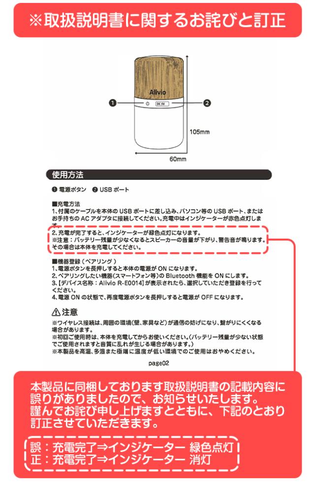 | ご注意 | ※Bluetooth接続していない状態では、ライトは約10分ほどで消灯します。 ・本製品は全てのBluetooth機器との接続動作を保証するものではありません。 ・分解、修理、改造しないでください。故障や感電、ケガをする恐れがあります。 ・濡れた手で使わないでください。また湿気の多い所でのご使用、保管をしないでください。感電や故障の恐れがあります。 ・発煙、発熱、異臭などの異変が生じた場合は、すぐに電源を切り使用を中止してください。充電中の場合は、すぐにUSBケーブルを抜いてください。 ・不安定な場所や振動する場所に置かないでください。本機が落下し、故障やケガの原因となる恐れがあります。 ・心臓ペースメーカーや、医療機器などの近くでは医師に相談の上お使いください。 ・航空機内や病院、医療機関など使用が禁止されている場所で使用しないでください。電波が影響を及ぼし、誤作動による事故の原因となる恐れがあります。 ・充電をしたまま放置しないでください。また充電中は周囲に物を置かないでください。 ・本体、また付属ケーブルを踏んだり、叩いたり等の強い衝撃を与えないでください。 ・内蔵バッテリーは繰り返しの充放電により消耗します。交換はできません。 ・子供や乳幼児の手の届く場所での保管、使用はお避けください。思わぬ事故やトラブルが発生する恐れがあります。 ・本来の用途以外には使用しないでください。 |