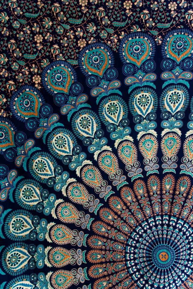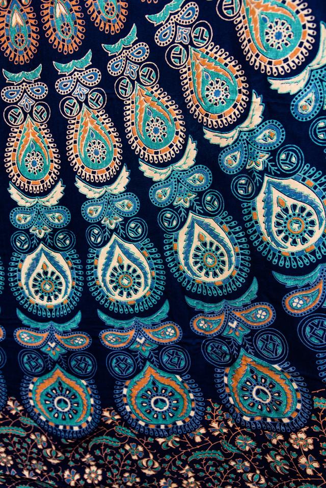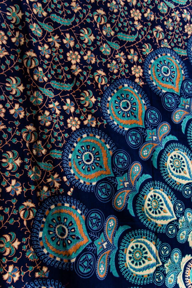 大きな布にとても丁寧に、インド伝統の唐草柄やマンダラ柄、象さんや、お花などがプリントされているので、こちら1枚をお部屋に飾るだけでアジアンなお部屋に大変身!