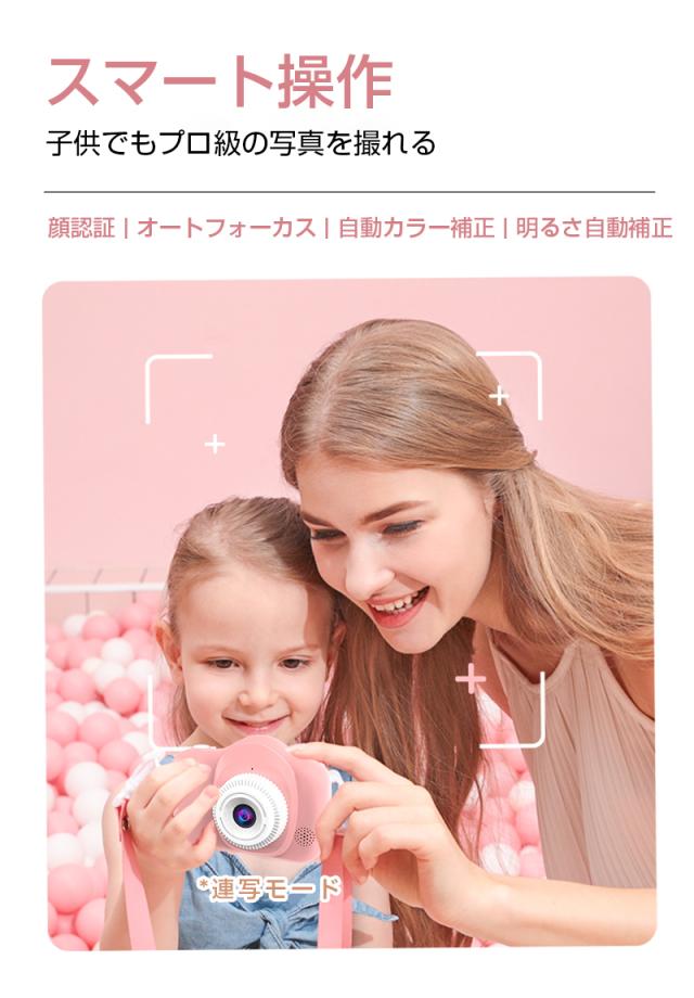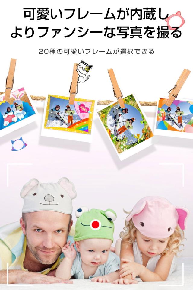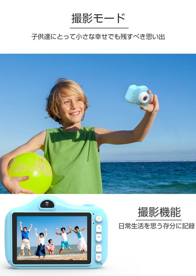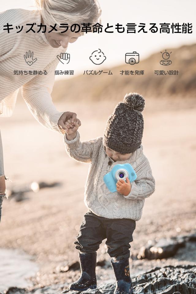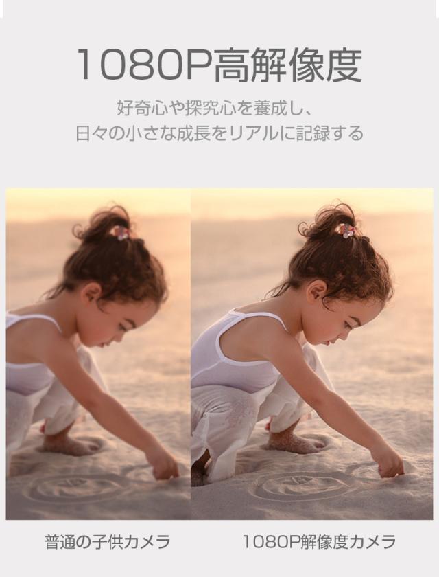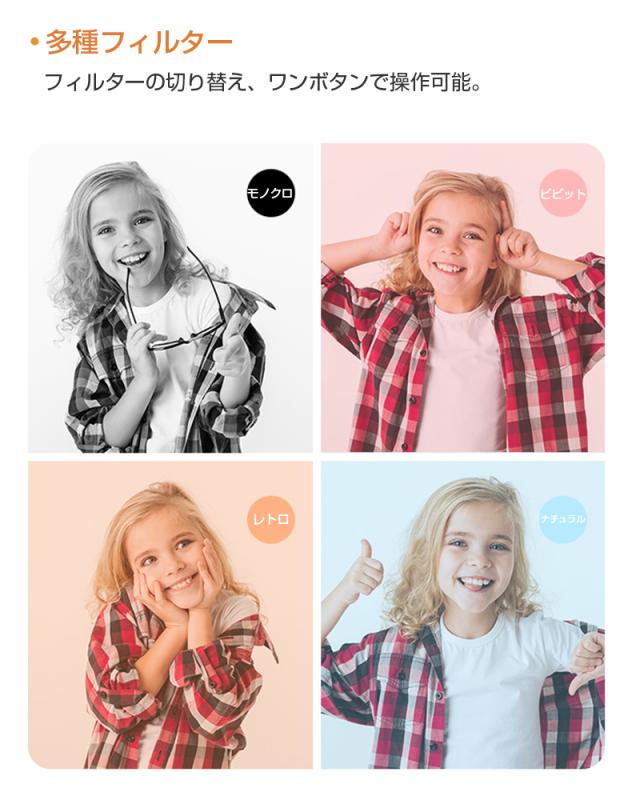 【多機能カメラ】タイムド写真、連続撮影、ビデオ録画、フィルター等の多彩な機能が搭載されていて、子供の好奇心を広げ、成長をサポートします。日付ラベルの追加もでき、大事な日を忘れずに記録しておきましょう。シャッターを押すだけで使用可能ですので、子供でもすぐ使いこなせます。