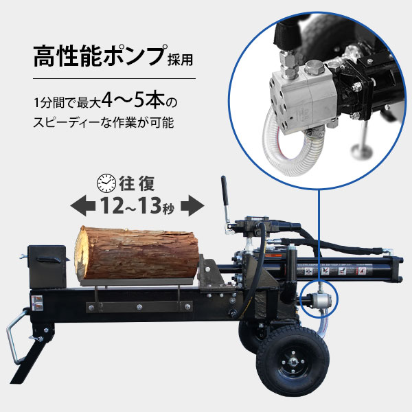 1回のサイクルタイムが12〜13秒!1分間で4〜5本のスピーディーな薪割り作業が行えます。