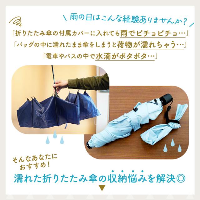 | 注意点 | ※完全防水ではございません。大量の水分を含んだ場合は、漏れる可能性がありますのでご注意ください。 ※傘のデザイン、形状によっては収納できない場合がございます。 ※カバーを無理に引っ張ることで、破れや破損の原因になる恐れがあります。 ※カビや色移りなどの原因となることがありますので濡れた傘を入れたまま長時間放置しないでください。 ※使用後は表面だけでなく、裏返し、内側の吸水生地部分も風通しの良いところで陰干しし、十分に乾燥させてください。 ※生地には、はっ水加工をしていますが、永久的なものではありません。ご使用を繰り返すうちに摩擦などではっ水性がおちてくることがあります。その際は市販の布製品用防水スプレーを表面から塗布することをおすすめします。 ※お子様がご使用の際は十分にご注意ください。 ※カメラやモニターの性質により、画像と実物の色の違いがある場合がございますのでご理解願います。 |