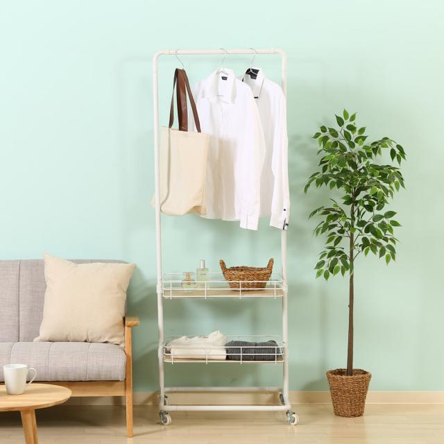 インテリアに合わせやすいバスケット付きハンガーラック