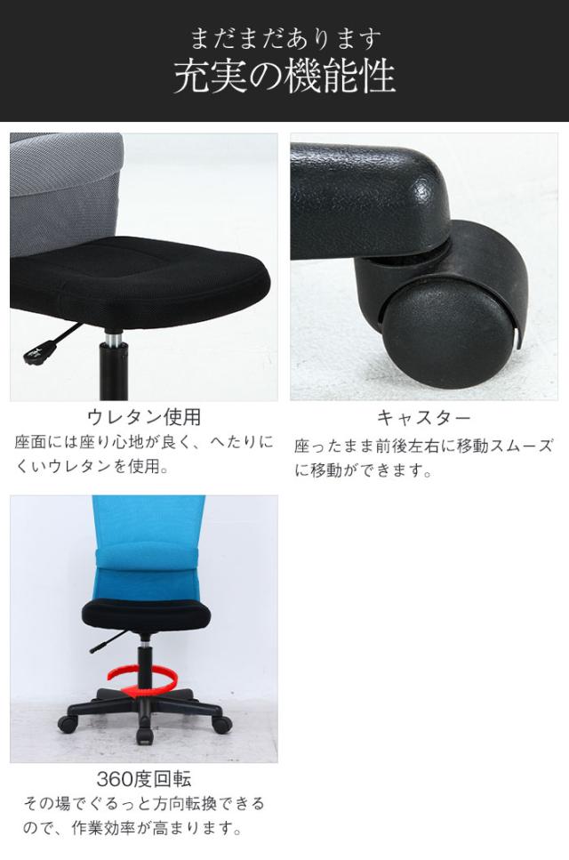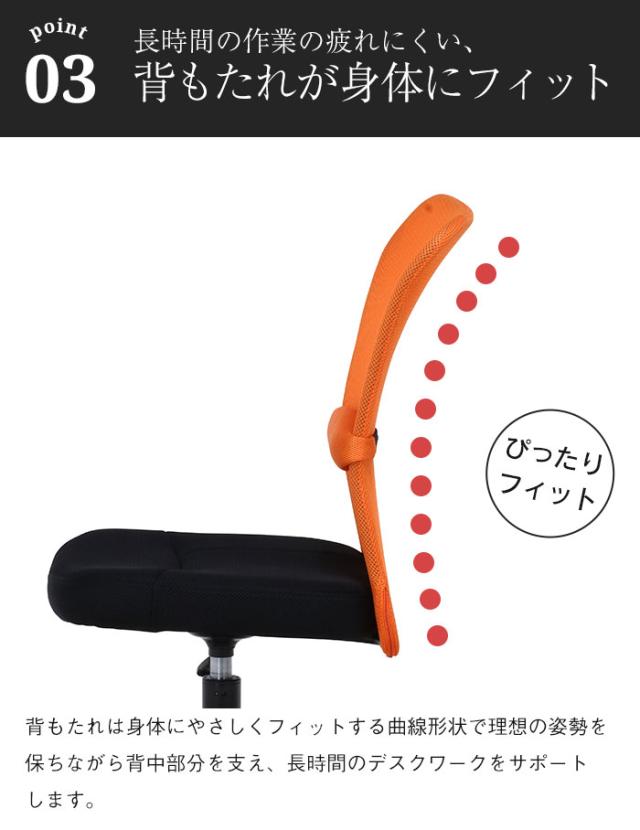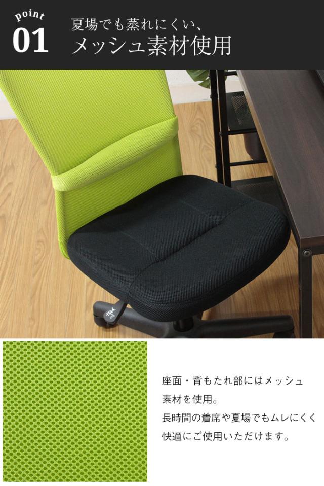 背もたれ・座面部にはメッシュ生地を使用しており、夏場でも蒸れにくく快適。