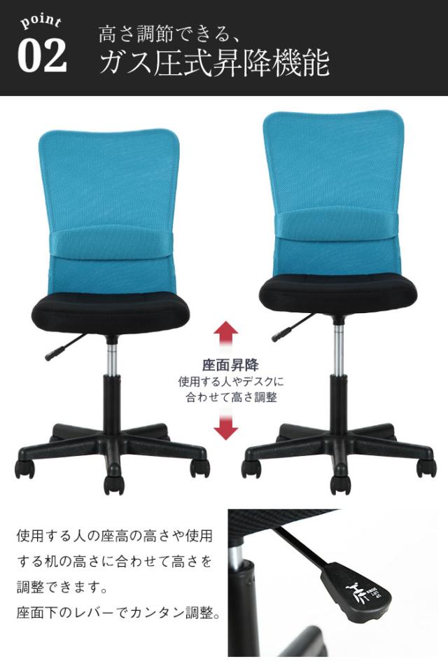 ガス昇降式でデスクや体型に合わせて高さ調節ができます。