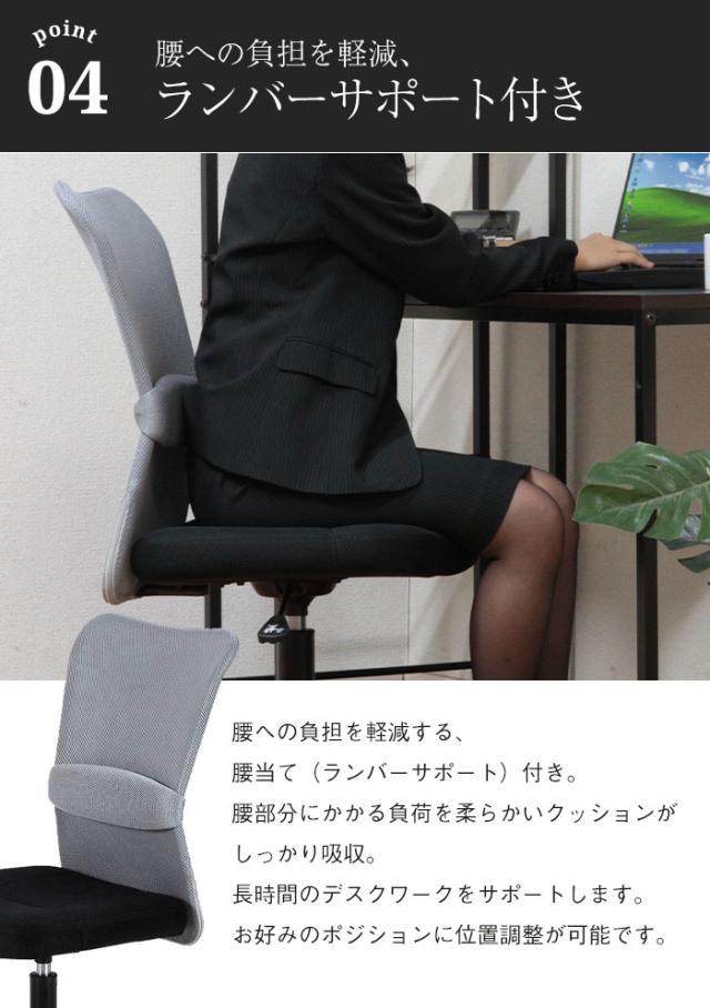 腰への負担を軽減する、腰当て(ランバーサポート)は腰部分にかかる負担を柔らかいクッションでしっかり吸収。